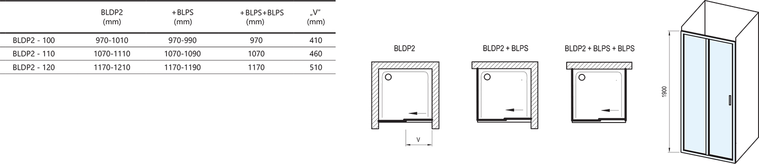 Výrobek tvoří jeden pevný díl a jeden posuvný díl jako dveře. Montuje se do obloženého rohu koupelny (ideálně do vyzděné niky nebo v kombinaci s pevnou stěnou BLPS) na vaničky Ravak Perseus Pro, Perseus Pro Chrome, Perseus Pro 10°, Gigant Pro, Gigant Pro Chrome přímo na podlahu se zabudovaným odtokovým žlabem či podlahovou vpustí. Kombinací se dvěma pevnými stěnami typu BLPS vytvoříte sprchový kout ve tvaru „U“. Použitím nastavovacího profilu BLNPS lze výrobek rozšířit o 20 mm.
