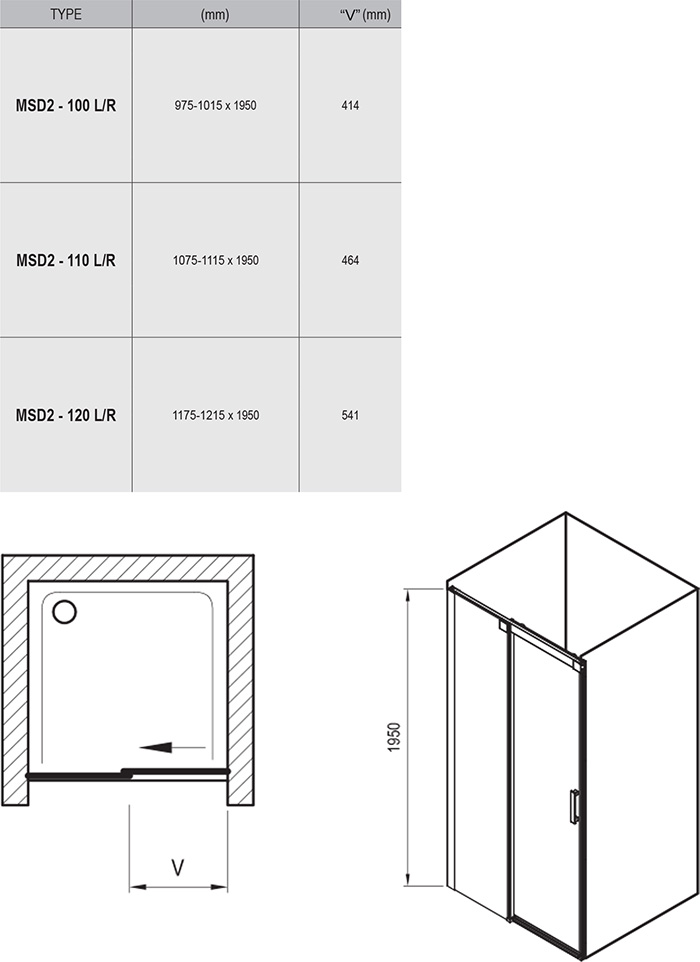 Výrobek se skládá ze dvou dílů, z nichž jeden díl tvoří posuvné dveře. Montuje se do obložené koupelny (do vyzděné niky) přímo na podlahu se zabudovaným odtokovým žlabem či podlahovou vpustí.