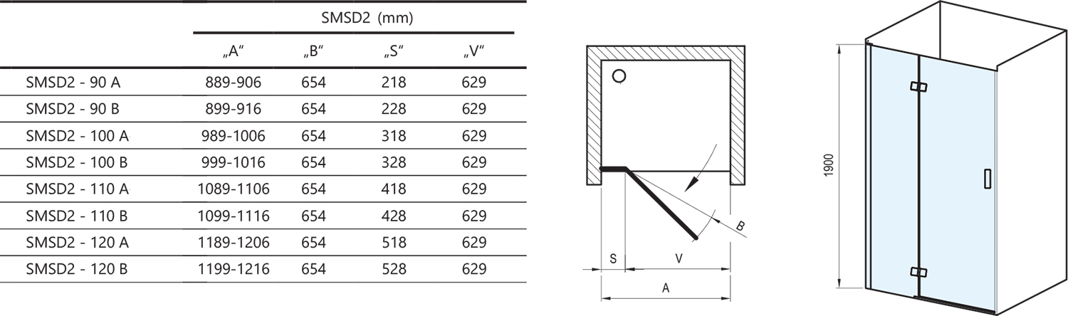 Sprchové dvere sa montujú do obloženého rohu kúpeľne (ideálne do vymurovanej niky alebo v kombinácii s pevnou stenou SMPS) na vaničky Ravak Gigant Pro, Gigant Pro Chrome alebo priamo na podlahu so zabudovaným odtokovým žľabom či podlahovým vpustom. Variant B je určený pre stavebný otvor až o 16 mm väčší, než je štandardný rozmer výrobku. Pre kombináciu s pevnou stenou voľte dvere typu B.