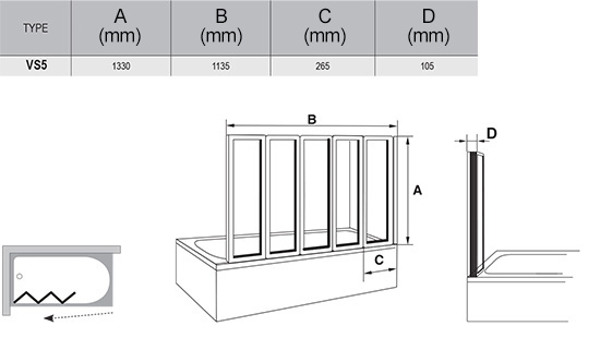 Zástěna se skládá z pěti pohyblivých dílů, které lze zcela složit (tzv. „harmonika“) do vnitřního prostoru nad vanu. Díky úzkým výplním zůstane po složení zástěny na okraji vany nejvíce místa. Vanovou zástěnu lze instalovat k obdélníkovým vanám (Classic, Classic II, Vanda II) nebo na jakoukoli klasickou obdélníkovou vanu s rovným horním lemem. Standardní výška zástěny je 1330 mm. Vanová zástěna VS5 má ve složeném stavu šířku 223 mm. Otočením vanové zástěny VS5 o 180⁰ získáme variantu vstupu zprava či zleva.