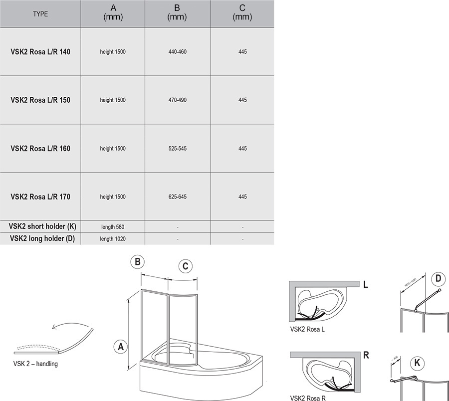 Vanovou zástěnu lze instalovat na Rosa II shodného rozměru a varianty (L/P) – (např. VSK2 Rosa 170 L k vaně Rosa II 170 L). Zástěna se skládá z pevné a pohyblivé části, kterou lze složit do vnitřního prostoru nad vanu. Konstrukce je vyrobena ze silnostěnných hliníkových profilů s kvalitní povrchovou úpravou a maximální těsností. Standardní výška zástěny je 1500 mm. Vanovou zástěnu VSK2 Rosa doporučujeme pro lepší fixaci upevnit pomocí držáku VSK2 krátkého nebo dlouhého, který je nutno dokoupit – není součástí balení.